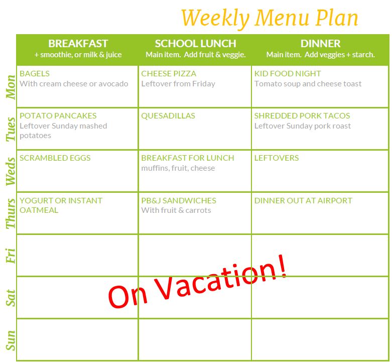 I'm keeping the lunches very simple - leftover pizza, quesadillas, some muffins from the freezer, and PB&J's on the last day - which will probably be packed in something disposable, so I don't have to wash lunch boxes right before we leave for the airport.
