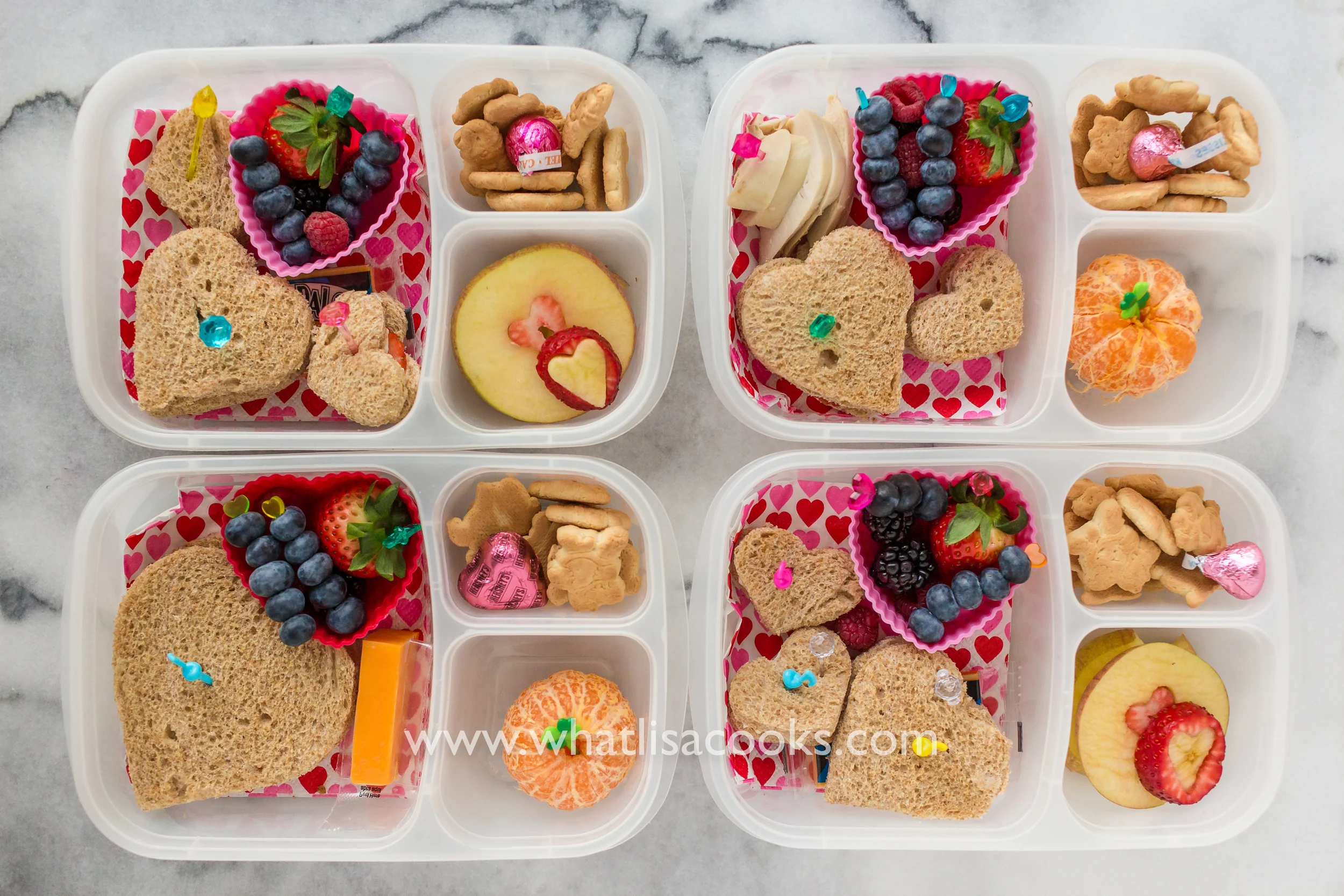 Since they were standing there when I made the sandwiches, they got to choose. One has just bread and butter, one has butter with strawberries, one has cream cheese with strawberries, one has butter and turkey. They have berries, animal crackers, and a chocolate kiss. Two have an orange and two have apples with strawberry heart centers. Three have cheese, and one has a few slices of chicken on the side.