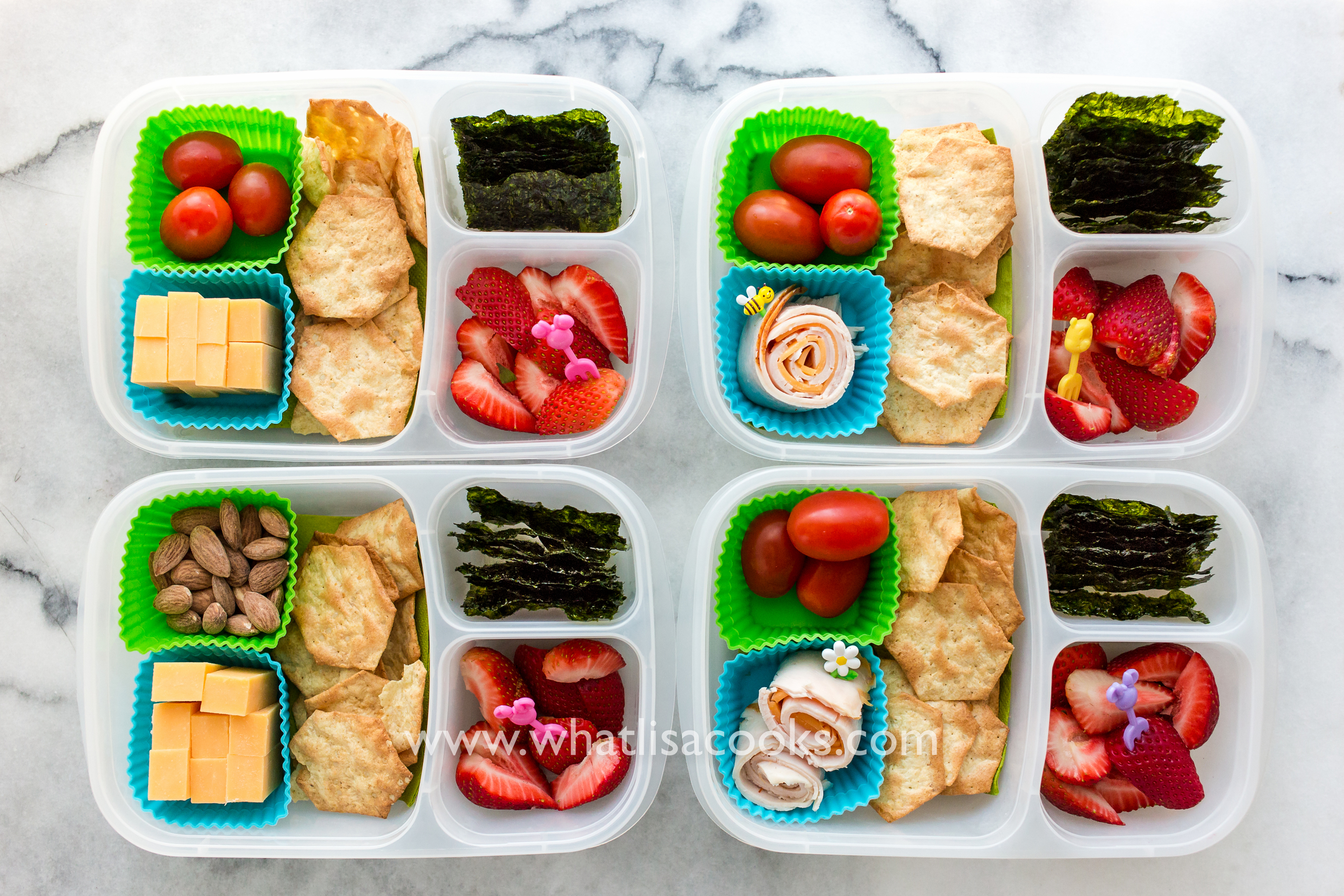 These lunches are gluten free! These are gluten free crackers, Milton's brand from Costco - they are so good! They all have cheddar cheese - two have it cut in sticks, and the two that eat meat have it sliced cheese rolled with a slice of turkey. They all have strawberries and seaweed snacks (from Costco). Three of them have tomatoes and one has some almonds.