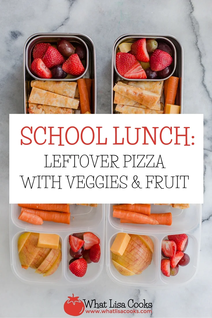 Each lunch has two slices of cheese pizza cut into small wedges, a whole carrot, half an apple, four big grapes, two strawberries, and a small chunk of cheddar cheese. The EasyLunchbox allows me to spread things out a bit more and the food is easier to see, while the ECOlunchbox is deeper so I have to stack things a bit more (the apples are tucked in under the other fruit in the small container that fits perfectly inside it), but it all fits in just fine.